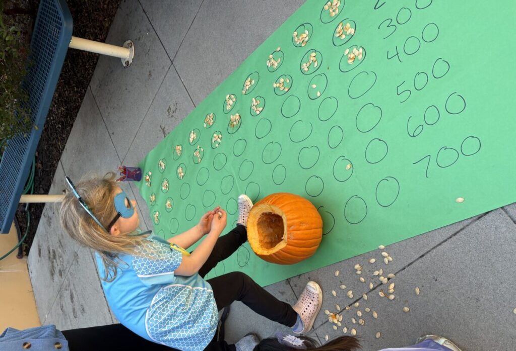 昼過ぎからは各学年でイベントがあり、私は一年生の長女のクラスのお手伝いへ。カボチャの重さを当てたり、水に浮かぶか否かを予想したり、種の数を数えたり、色んなゲームが用意されていました。子供達は、種やワタのぐちゃっとした感触が気持ち悪いらしく、「Ewww!!!!!!」と絶叫していました(笑)。