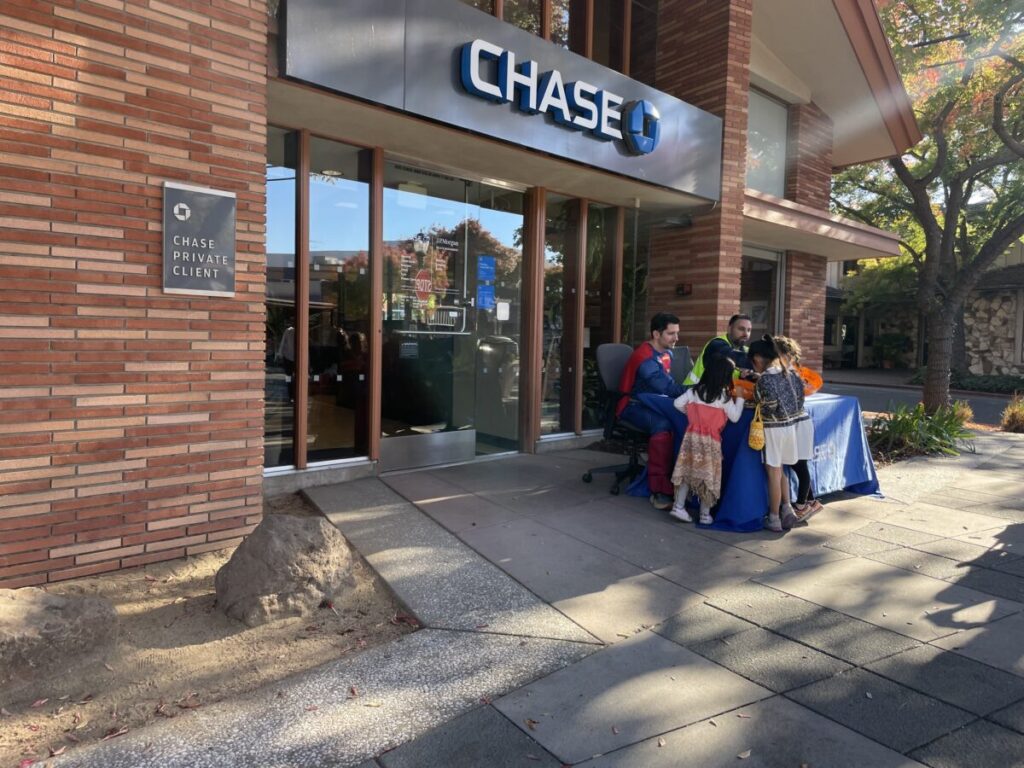 放課後は、お友達とLos Altos(ロス・アルトス)ダウンタウンのTrick or Treatへ。我が家は今年で4度目の参加。商店街のお店や銀行がお菓子を配ってくれます。